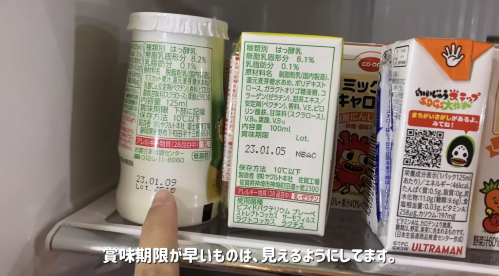 早く消費しないといけない物を、目のつきやすい所に置き、さらに賞味期限を見せるように置く。