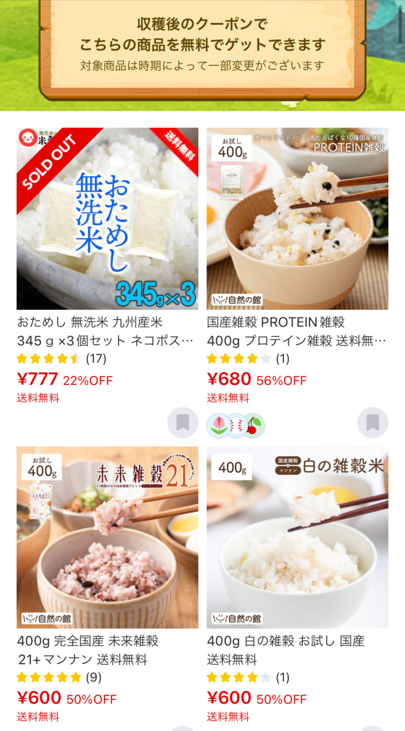 作物によって、育てやすさが違うようですが「お米」を選んだから「お米」が貰えるというわけではなく、収穫できたら100%無料になるクーポンが発行されます。