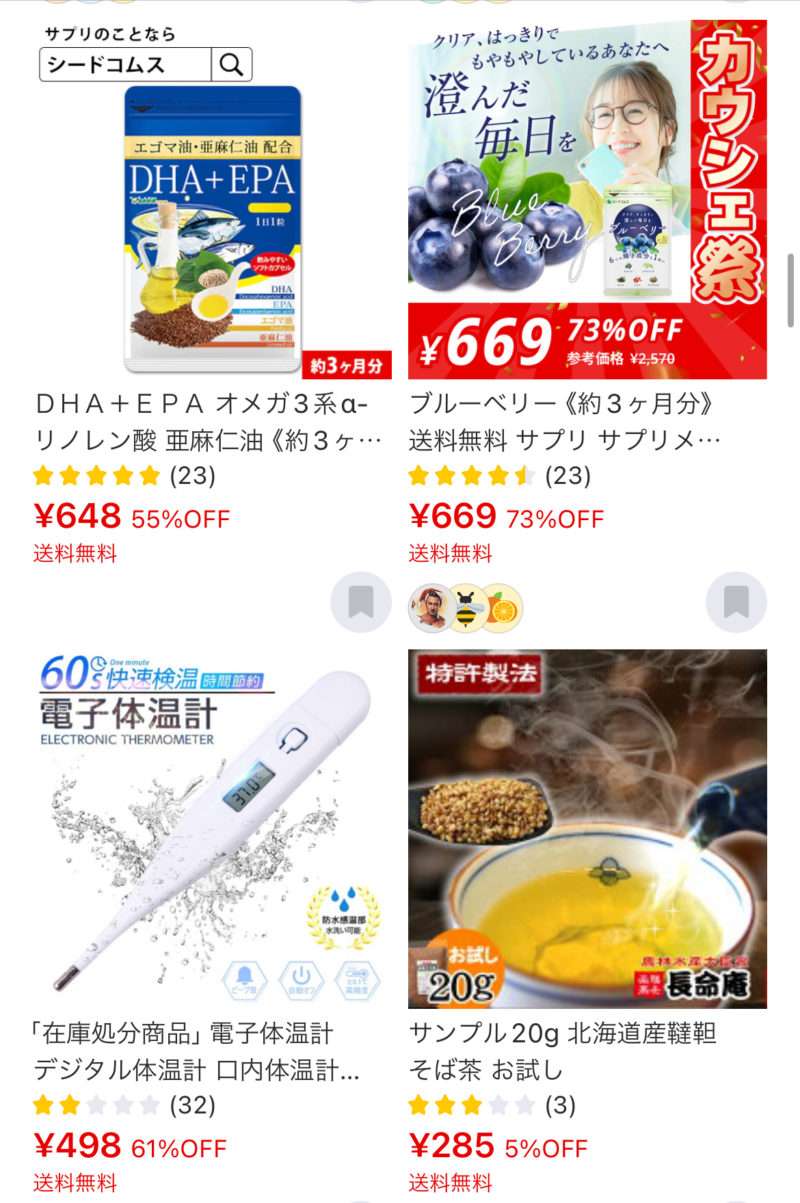 カウシェは、タイムセールみたいに「ゲリラセール」とかあっていて、楽天とかより商品が安くなる時があるよ。