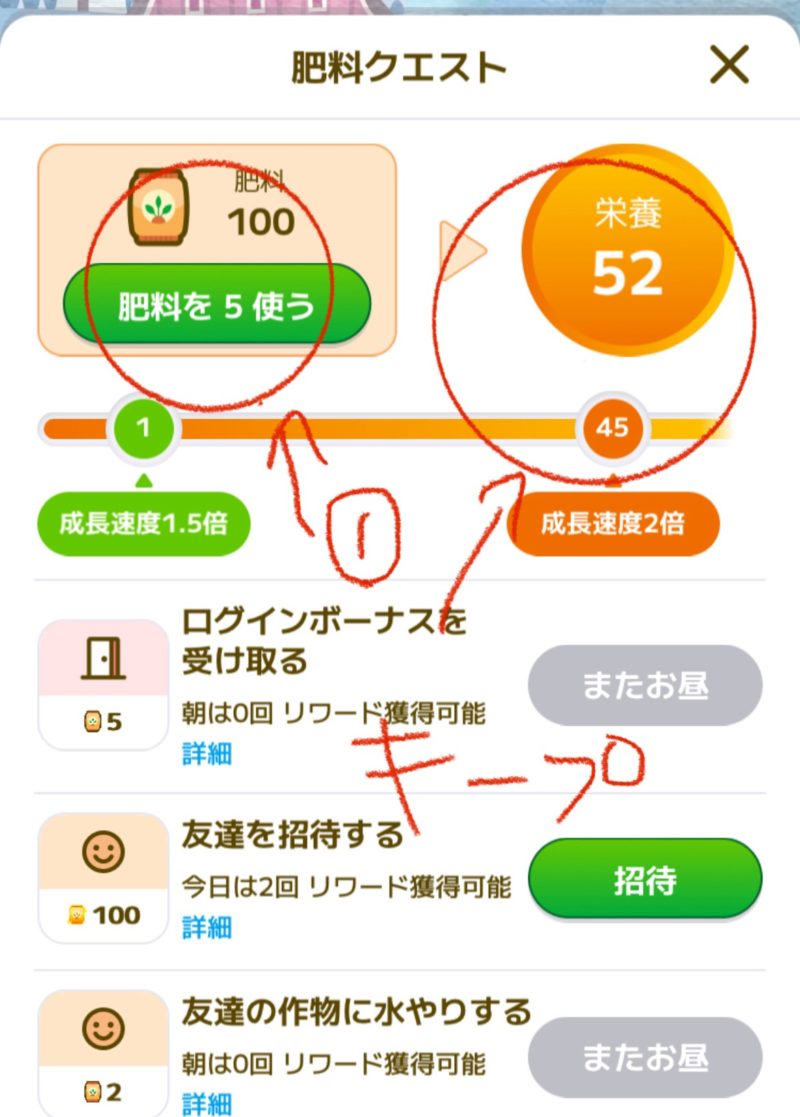 友達が自分のリンクから入ると、肥料200個もらえるので「肥料を使う」を押して