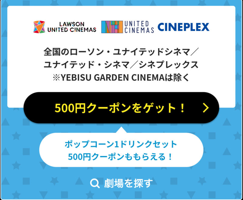 対象劇場は、全国のローソンユナイテッド・シネマ/ユナイテッド・シネマ、シネプレックスです。