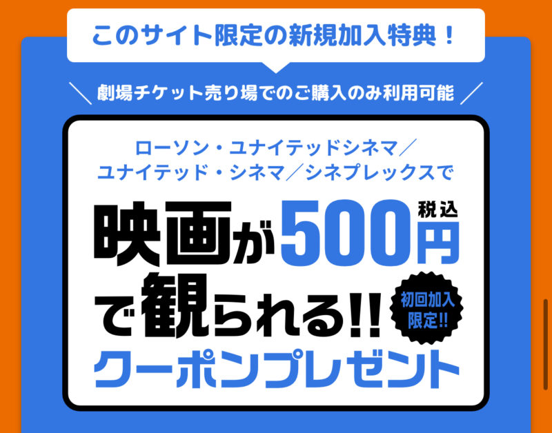 初回特典として、「映画を500円で見れるクーポン」が配布されてます。