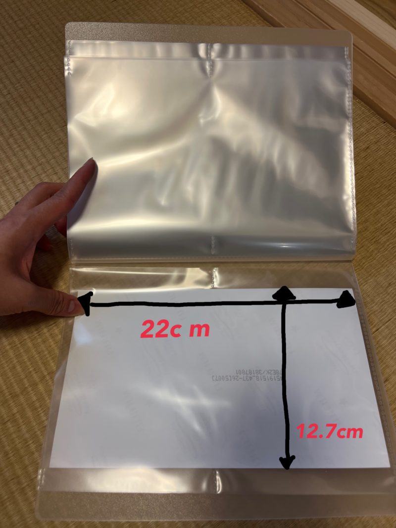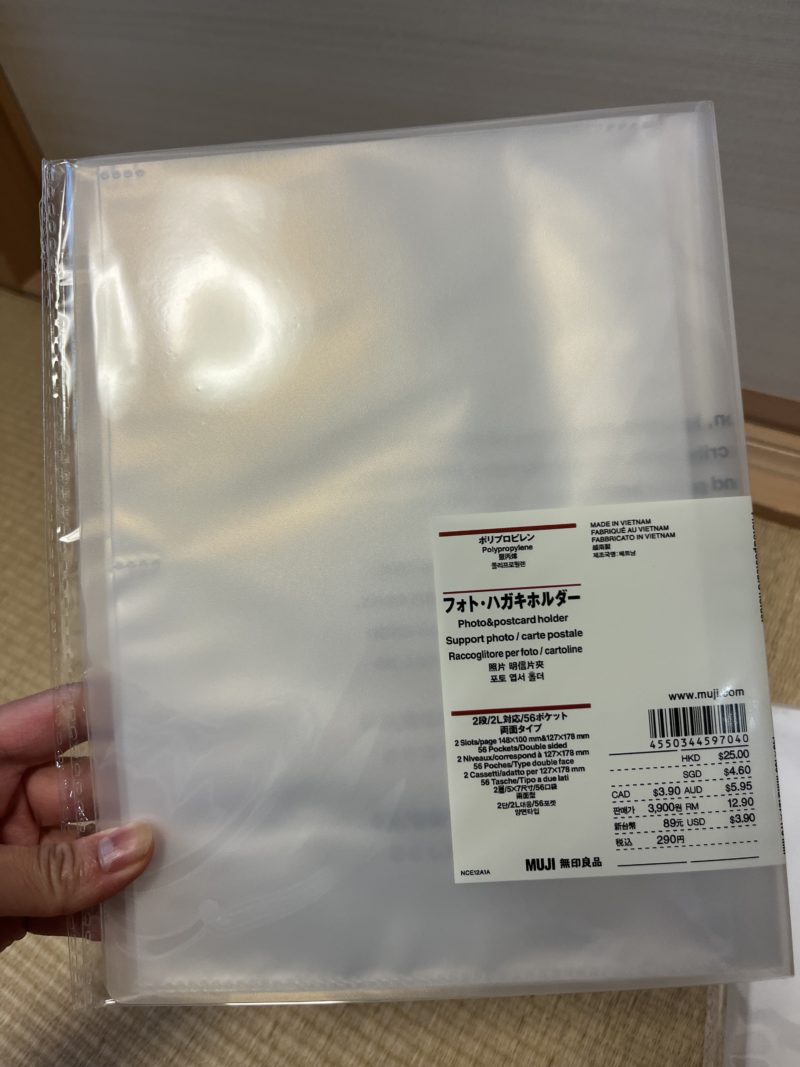 色々調べてみると、「無印のアルバムのフォト・ハガキホルダー」にぴったり収まる事がわかりました!