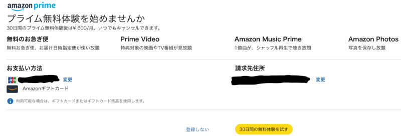 これで、30日間無料のAmazonプライム会員の登録はOKです。