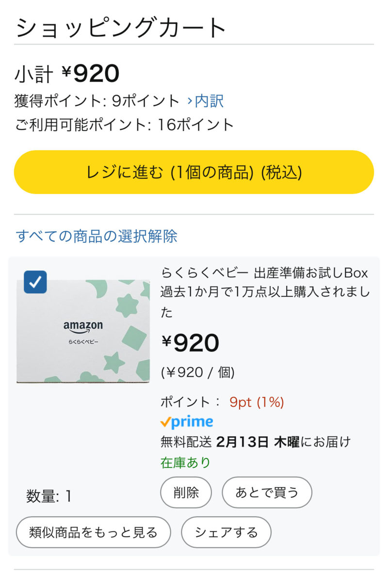 出産お試しBOXをカートに入れると、920円と表示されますが、最終的に
