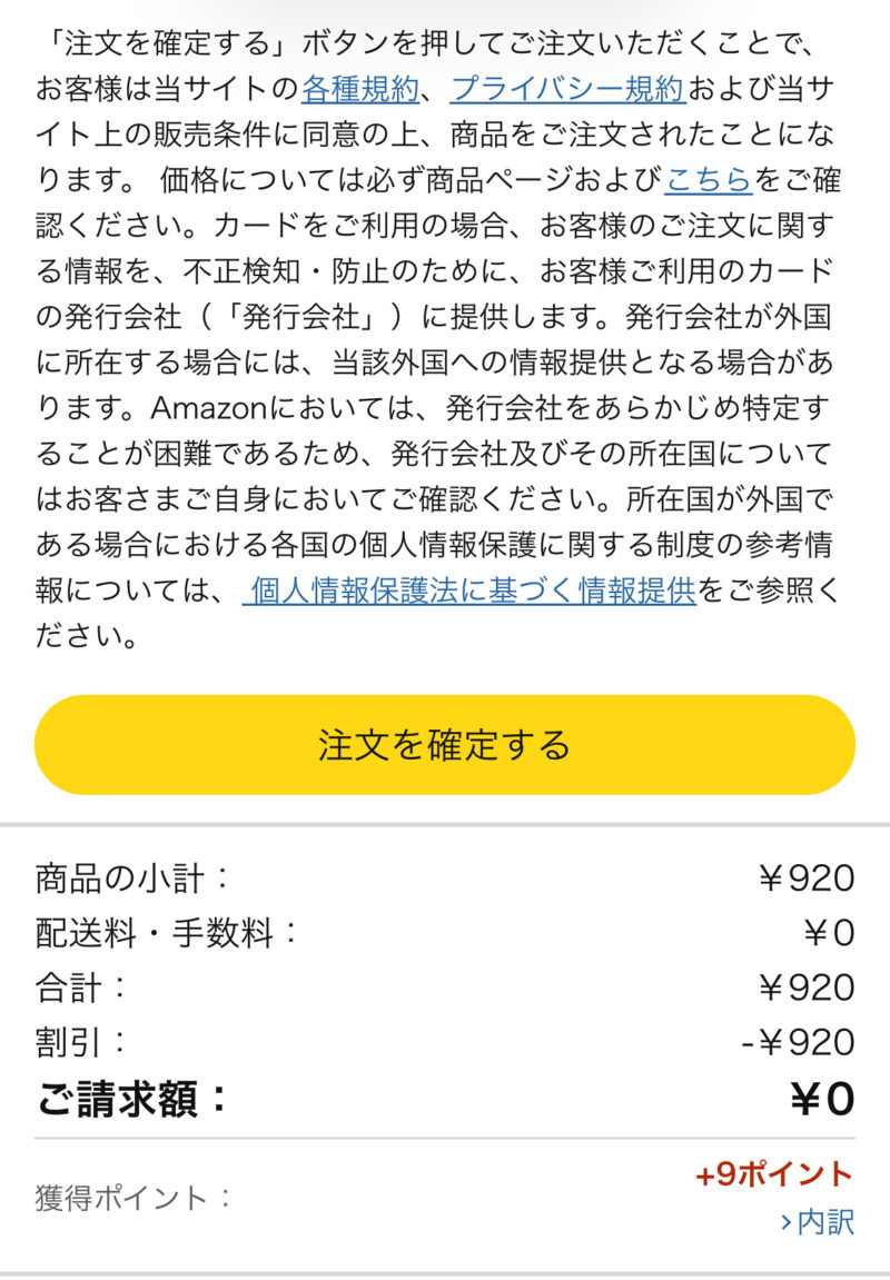 注文確定の前に「0円」になっている事が確認できたら、