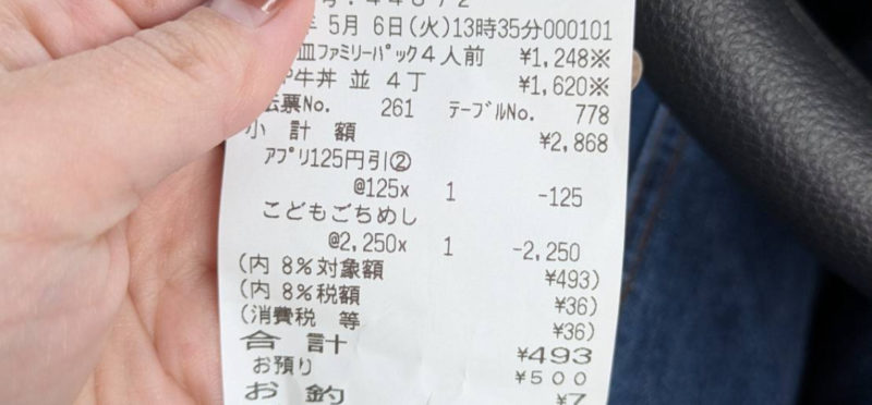 吉野家は、子供1人1000円ではなく750円です。