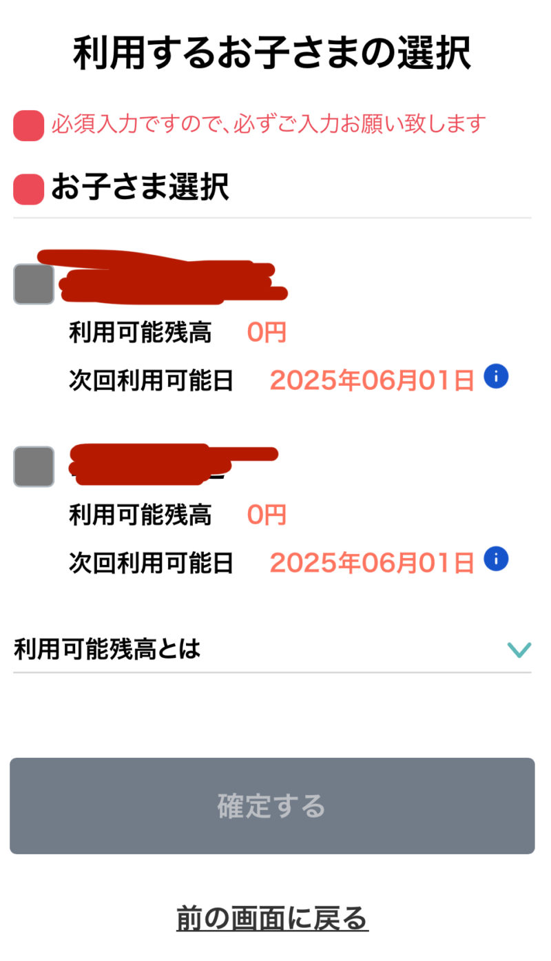 会計する時に、この画面から「利用する」を押したら、子供の名前が出てきます。