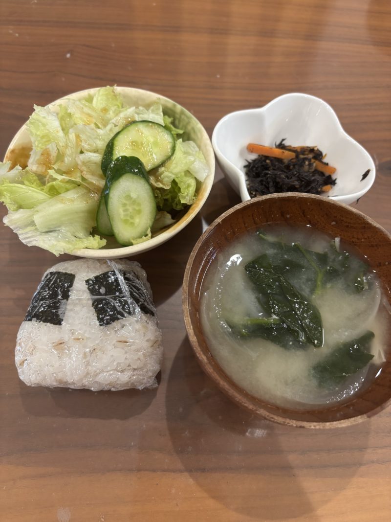 朝は、ご飯、味噌汁、納豆、ぬかづけとか目玉焼きとか。
