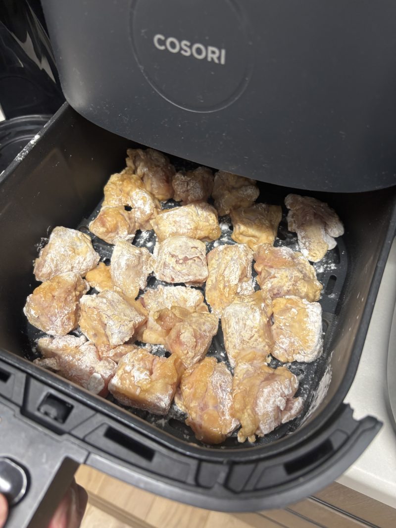 お肉切って、味付けして片栗粉まぶしてコソリに入れて15分で完成〜!